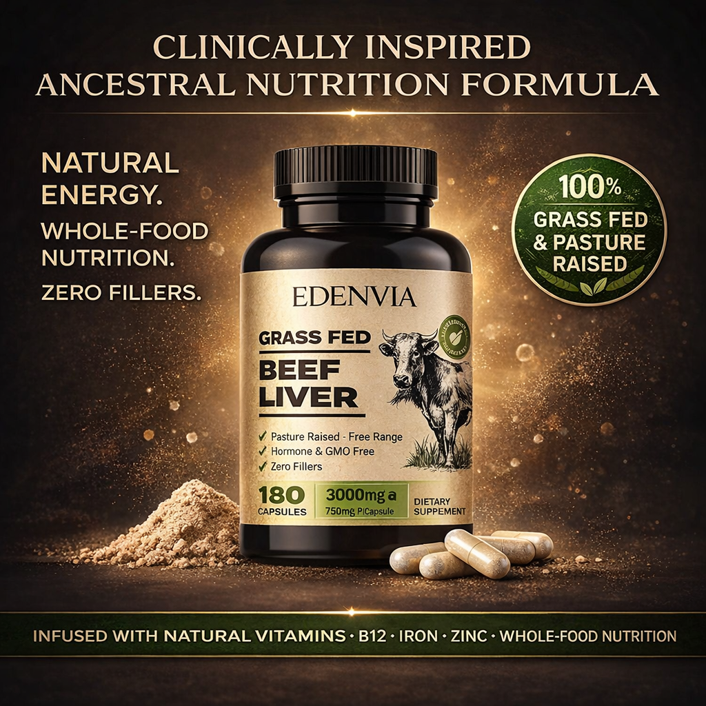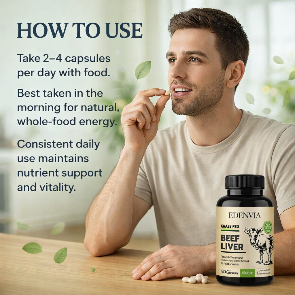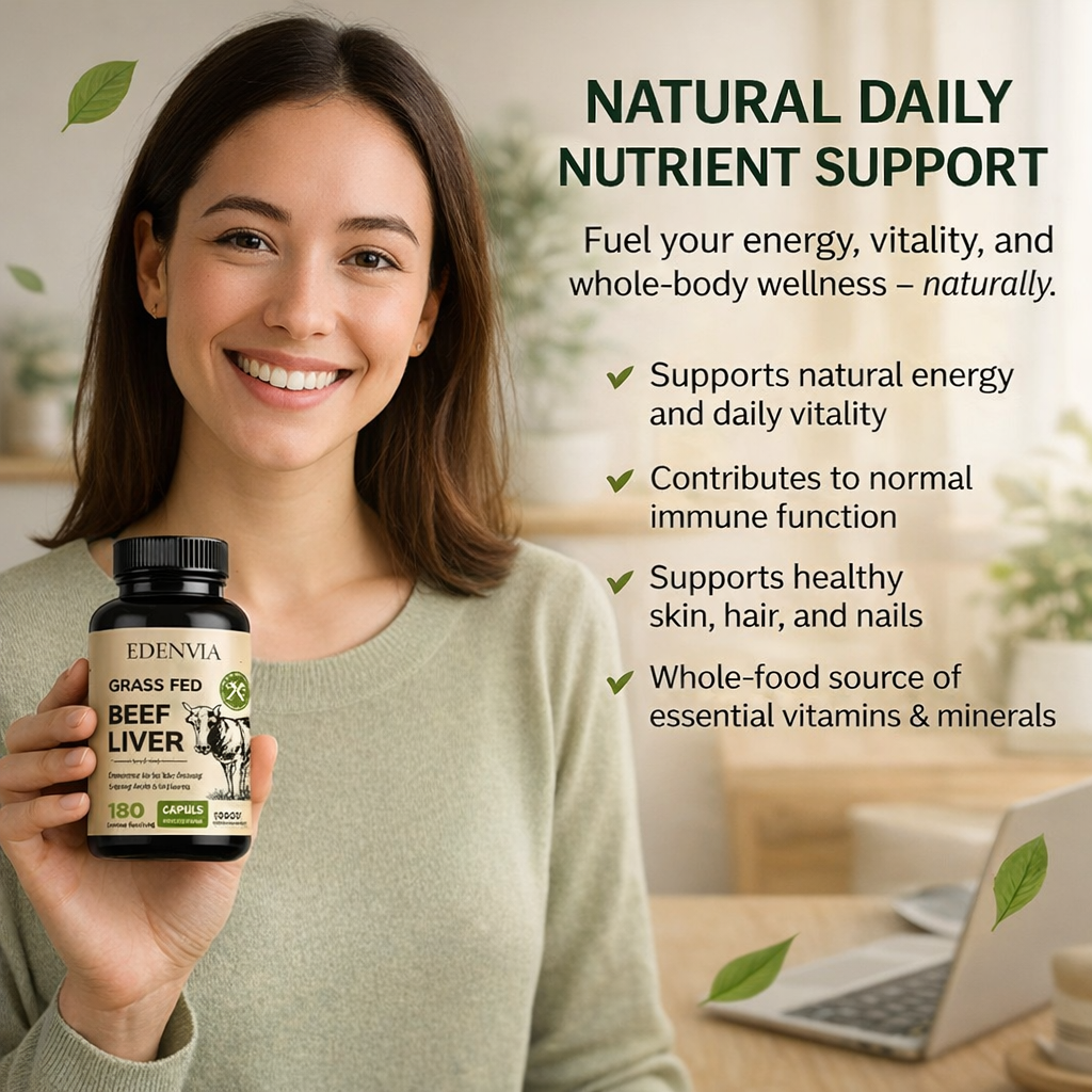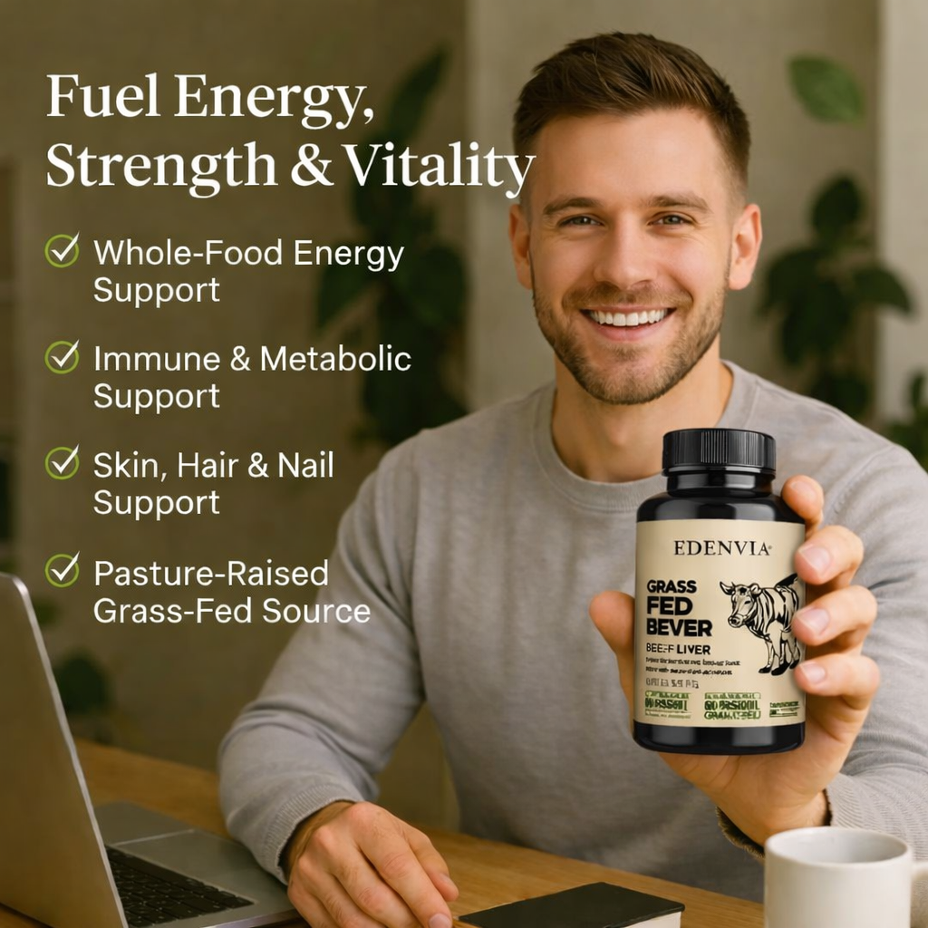 EDENVIA Grass Fed Beef Liver is a whole-food nutrition formula designed to support daily energy, vitality, and overall wellness. Naturally rich in bioavailable nutrients such as vitamin B12, vitamin A, iron, zinc, copper, and choline, it helps support cellular energy production, healthy immune function, mental clarity, and normal circulation. Because it’s sourced from grass-fed cattle and made with zero fillers, many users begin noticing improved energy and focus within 1–2 weeks of consistent daily use, with whole-body benefits continuing to build over time.