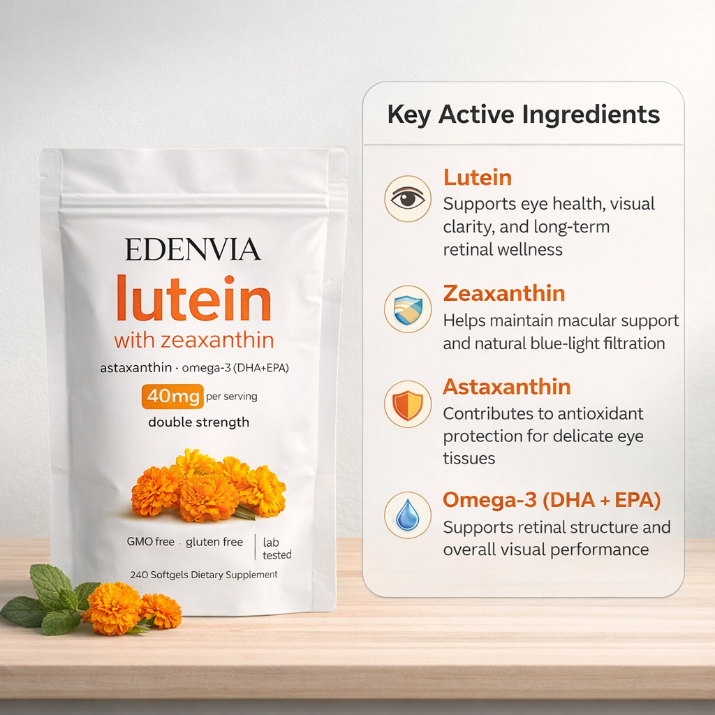 EDENVIA Lutein + Zeaxanthin is a daily eye wellness formula designed to support visual clarity, retinal health, and long-term eye nutrition in a screen-heavy modern lifestyle.
